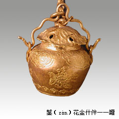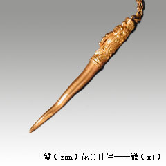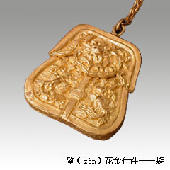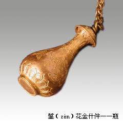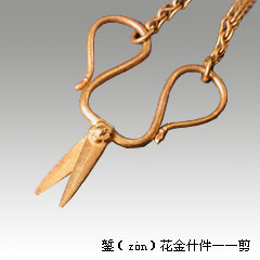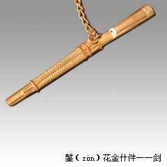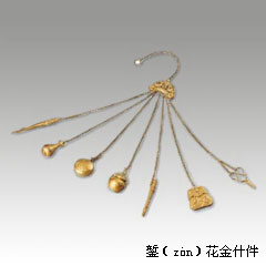 这是古人随身携带的方便饰件,相当于今天的“瑞士军刀”,而这套全部为金饰品,它不为一般人所拥有,它的拥有者是明代成化皇帝的宠妃——万贵妃的父亲万贵,父以子贵,因而万贵也过着非常豪华的生活,这套饰品随葬于万贵墓中,从左边开始依次为觿(xī)、瓶、盒、罐、剑、袋、剪。觿是古人用来解扣的工具,古代没有纽扣,从帽子、上衣至裤子全用带子来系,因而解开带子的扣儿是一项很复杂的工程,需要专门的工具;盒子一般放一些随身携带的香料等;剑相当于现在的刀子;剪刀和现在随身的小剪刀的功用也是一致的。这七件饰品由金链子系于上面的荷叶形牌饰上,牌饰上錾刻两只鸳鸯立于荷叶上,每件饰物上又各有花纹,十分精美。(撰稿:裴亚静)