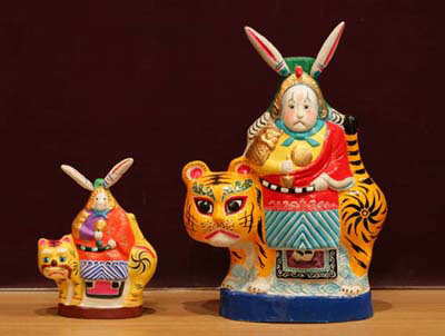 兔儿爷是北京的泥塑玩具。相传兔儿爷的形象就是月宫中的玉兔,是唯一受香火供奉的玩具。兔儿爷的样式有数种,但本身的装束都一样,以坐虎的为多,虎分黄、白、黑三色。