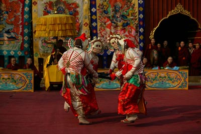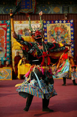旧时春节是从腊月初八喝“腊八粥”开始,到正月底雍和宫“打鬼”结束。打鬼是俗称,本名叫“跳布札”,是蒙古语,意为驱魔散祟。跳布札(zhá)时,喇嘛们带着面具,身穿五颜六色的衣服,在鼓乐和诵经的声音中舞蹈,场面庄严而热烈。跳布札分为13场,以消灭魔王告终。1957年以后跳布札曾经中断多年。如今雍和宫恢复了春节跳布札的活动,得到中外游人的广泛好评。(撰写:朱锴)