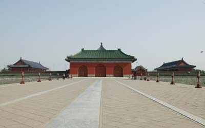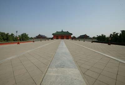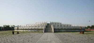 天坛位于崇文区天桥南大街东侧,是明﹑清两朝皇帝祭天﹑祈(qí)谷﹑祈雨的场所。明永乐十八年(1420年)始建,1998年被联合国教科文组织列为“世界文化遗产”。天坛有两重围墙,外围北面为圆形,南面为方形,表示“天圆地方”。天坛是圜(huán)丘坛和祈谷坛的总称。圜丘坛在南,祈谷坛在北。圜丘坛是皇帝祭天的场所。古代称奇数为阳数,也叫天数,代表天,9是最大的天数。因此圜丘坛的坛面、台阶、栏板所用的石板、石块的数量都是9的倍数。