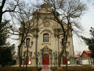南堂位于宣武门,是北京最早的天主教教堂。明代万历三十三年(1605)天主教耶稣会传意大利教士利玛窦(dòu)在此创建教堂。清代顺治七年(1650)掌管朝廷天文机构的耶稣会传日耳曼教士汤若望主持南堂重建。汤若望原来为明朝修订历法,制造火炮。清朝建立后,他得到了顺治皇帝的信任。顺治称他为“玛珐”,满语意思是可亲可敬的长者。当时有许多为朝廷服务的传教士,如南怀仁、张诚、白晋等人。康熙皇帝表示,只要传教士尊重中国的法律、风俗,允许教徒祭天、祭祖、祭孔,不限制他们传教。他还亲自为堂题写了碑记和匾额。据说,从1651年到1664年,全国入洗的教徒达到10多万人。