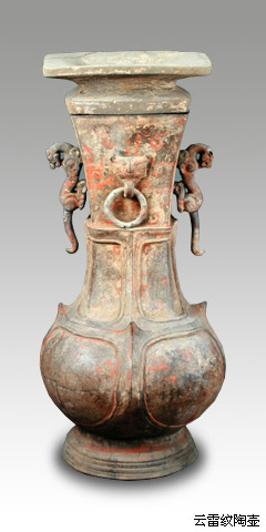 这是北京昌平地区一座战国墓中出土的一件陶壶,方口,长颈,四周有对称的铺首衔环耳和老虎形的耳朵,颈部及腹部四围出戟,浑身上下画满了红色的流云。它很象青铜器的造型,确切地说,它的确是仿青铜器的,而且,和这件壶一起出土的还有彩绘陶簋(guǐ)、陶鼎、陶豆、陶匜(yí),是一套和青铜器一样的陶器组合,这是一座贵族墓吗?不是!因为周代的等级制度到战国时期已经发生了变化,它不再那么严格,甚至已完全遭到了破坏,墓葬用鼎簋制度仍然存在,但已不再局限于贵族墓中,普通的平民在死后也开始随葬成套的陶礼器,只是他们用不起铜器,而以成套的陶礼器来代替,即所谓战国时期的“礼崩(bēng)乐坏”。(撰稿:裴亚静)