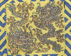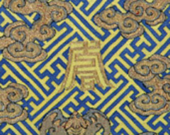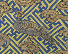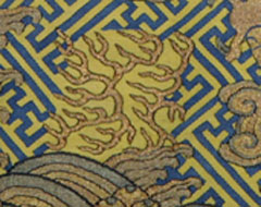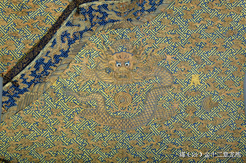 这是一件乾隆皇帝的龙袍,因为上面绣了十二章花纹,在古代只有皇帝的龙袍才能织绣十二章,那么十二章十指什么呢?有太阳,月亮、星辰、山岳、龙、雉(zhì)鸡、虎雉、水藻、火焰、白米、斧、弓。太阳、月亮、星星表示光明来临,山岳表示稳重,龙表示变化无常,雉鸡表示华丽,虎雉表示孝敬,水藻表示清洁,火焰表示光明,白米表示教益,斧子表示是非分明,弓表示弃恶扬善。这件龙袍用金线以缂(kè)丝的方法织成,十分华美。(撰稿:裴亚静)