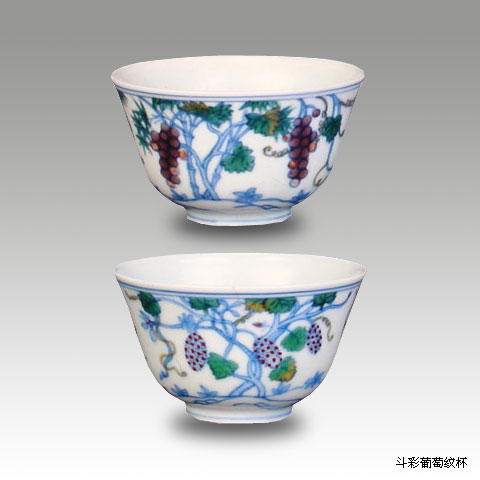这件杯子虽然出土于清代一座贵族小女孩的墓(小西天黑舍里氏墓)中,但它却是明代成化时期的官窑瓷器,而且是当时最好最有名的瓷器——斗彩。成化皇帝有个宠爱的妃子,叫万贵妃,比成化皇帝年长17岁,他事事都听万贵妃的。但在生活中他是个很有艺术气质的人,比较喜欢小件的艺术品,瓷器史上最好的斗彩瓷器就是这个时期烧制的,万历时期提起成化斗彩鸡缸杯一对,价值百金。斗彩是指釉(yòu)下青花和釉上各种彩色争奇斗艳,娇艳妩媚,它的做法是先用青花绘画图案轮廓或局部图案,罩上一层透明釉,在1200多度的高温下烧制,烧成后再于釉上用红、黄、绿、紫多种颜色绘画图案,七、八百度温度烧成。成化斗彩的花纹有花果、海兽、人物、鸟虫等,非常精致。(撰稿:裴亚静)