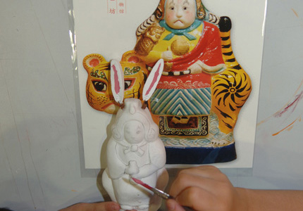 2、 绘制颜色,用毛笔将颜料涂在已经打好底稿的石膏模子上,绘制出预先设计的图案。