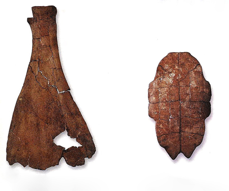 甲骨文主要是指乌龟的甲壳和牛骨头。乌龟的甲壳是由背甲和腹甲两部分组成的。用来刻字的多数是腹甲,这是因为腹甲较平整,使用起来比较省事。背甲是拱起的,使用前要有较多的加工整治才行。牛骨,主要是用肩胛骨,因为它比较平整,面积也较大。也有极少的牛肋骨和羊骨等。