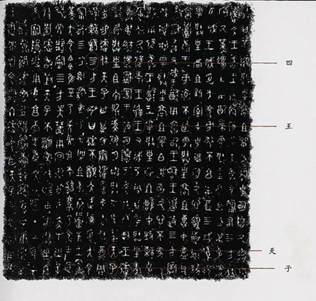 现在,请你看看铜盘上的文字,这里有你认识的两个字,它们还多次出现,一个是“王”字,一个是“四”字,你一眼就看到它们了吧。这铜盘上的字共有370多个,是新中国成立以来所有出土的铜器中,文字最多的。你可千万别小看这370多个字,它可解决大问题了。这铜盘上的文字,告诉了我们许多以前不知道的事,而且是特重要的事。举个例子吧,这铜器不是单氏家族的吗?可这单氏家族是在什么时候发达的?他们一代一代是怎么传的?他们居住在什么地方?以前,由于缺乏材料,人们一直弄不清楚这些问题。这回好了,铜盘里的文字就好像一部完整的单氏家族史,记述了单氏家族每一代首领的名字,还讲了他们的功绩,这就有可能解开单氏家族之谜。这方面的事,咱们不多说了,你要是有兴趣的话,等过些年咱们再讲吧。现在,我再帮你认识这盘子上的两个字,一定挺有意识的。从右边竖着数到第12列,最下边的两个字,上边那个字像不像是正面站立的一个人,向两边伸着胳膊、叉着腿,头部变成了一横,这个字读作“天”。古代人认为,这天在人的头顶上,没有什么比天更高了,所以是最大、最高的。于是人们说这天字可分成“一”和“大”,也就是第一大。“天”的下面是个“子”字,它多像一个活泼的小婴儿,大大的头,两只手臂上举,因为小婴儿还不会走路,要人抱着,所以只画了一条腿。将“天”和“子”合起来读,就是“天子”一词,这可是堆当时最高统治者的称呼。周朝的王,被称为周天子,后来的皇帝,也称天子,他们是天的儿子,多厉害呀!在这篇文章里,写了几个“天子”呢?你找一找好吗?