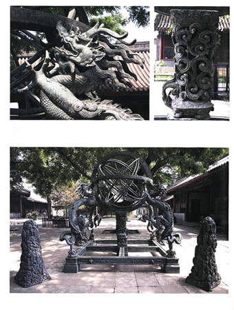 观星台刚建成的时候,什么仪器也没有,全凭人用眼睛观测,慢慢才铸造了几件大型的铜仪器。到300多年前的时候,有几位懂天文的西方传教士来到北京,受到清朝政府的重用。他们根据欧洲的科学知识,重新铸造了几件天文仪器。