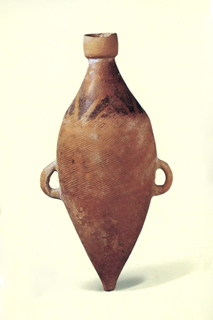 人,每天都要喝水,咱们再说一件半坡姑娘打水用的陶瓶吧!这个尖底的瓶子是半坡姑娘最喜欢用来打水、运水用的工具。它的口很小,可是肚子比较大,还有两个耳朵。你想想,半坡姑娘为什么喜欢用这种瓶子呢?原来这大肚子就能多装一些水;小口呢,在运水的时候,水不容易流出来;两个耳朵穿上绳子,就像你背书包似的,可以背上,也可以挎在肩上,还可以背上一个,一只手各提一个,一次就能运三瓶水。知道它的好处了吧!还有一个好处哪,由于瓶子底是尖的,上面重,下面轻,当人们把瓶子往水里一放,它一下就能躺在水面上,水咕嘟、咕嘟就灌到瓶子里去了,等大肚子灌满了水,下头又重了,瓶子自己就在水里立起来了。半坡人多聪明呀!