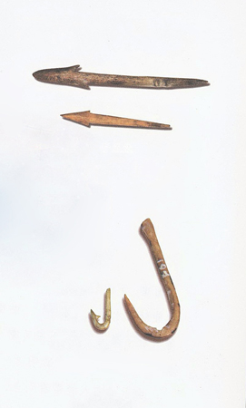 咱们看看他们在吃什么吧:他们今天的运气还真不错,煮了一大锅粥饭,还加了鱼、鹿肉和一点小白菜。要是赶上捉不到动物的时候,就只有煮粥加点野菜了。因为那时候,人还很少,天气暖和的时候,钓条鱼、打只鹿,找点能吃的东西,还算容易,可是,到了大冬天的时候就困难了。用什么钓鱼呢?这个问题难不住你,你可能早就从爸爸、妈妈那里知道了要用鱼钩钓鱼。半坡人那时就很聪明,他们用骨头制成鱼钩,还在上面磨出了倒刺。这样,鱼一上钩,就跑不掉了。那时候,河里的鱼特别多,还可以用鱼叉扎鱼。一开始,人们只会做直鱼叉和没有倒刺的鱼钩,常常是被扎上的鱼使劲一扑楞就跑掉了。人们不住地想办法,改造自己的工具,结果,鱼钩、鱼叉都有了倒刺。