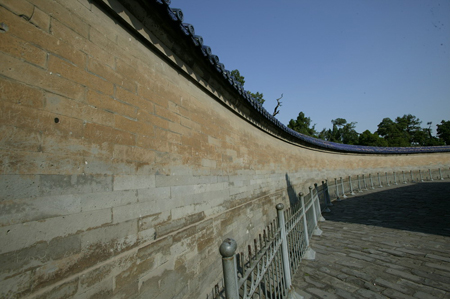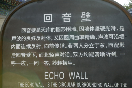 回音壁就在皇穹宇中。皇穹宇是放置圜丘神牌的地方。人们在游览的时候往往只会注意到这里的回音壁,没有谁记得皇穹宇是什么。回音壁是围绕大殿的一道圆弧形磨砖对缝的砖墙,又叫传声墙。墙的弧度十分规则,表面极其光滑,对声波的折射比较规则。如果两人分别站在东西配殿后,面北站立,一个人挨着墙说话,另一个人耳贴墙壁,即使声音很小,对方也能听得清楚,而且回音悠长,好似从墙中发出一般。