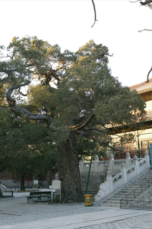 在孔庙大成殿的右前方有一棵古柏很值得一提。它枝繁叶茂,虬枝盘曲,苍翠挺拔,相传这株古柏是元代国子监祭酒许衡亲手所种,已近700岁的高龄,它经历了风雨沧桑,被人们称作有灵性的树。传说明代奸相严嵩平时欺上压下、残害忠良,有一次他代替嘉靖皇帝来孔庙祭孔时,在走过这棵树时,忽然刮起一阵狂风,吹得柏树枝干把严嵩的帽子打在地上。这样,人们在痛恨奸臣的同时,也认为柏树有灵能够辨别忠奸,所以把这棵树叫做“触奸柏”。