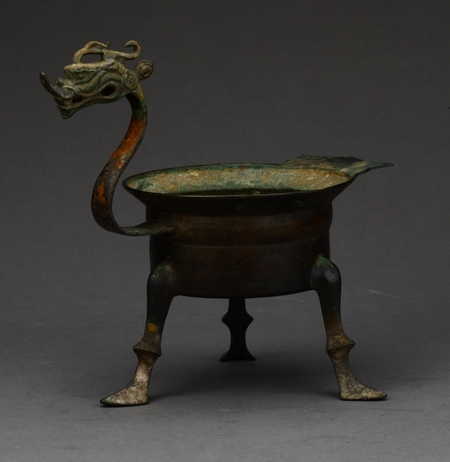 鐎(jiāo)斗又称“刁斗”,是古代军队“昼(zhòu)炊(chuī)饮食,夜击持行”随身携(xíe)带的军旅炊器,盛行于战国、汉及魏晋时代。作为古时军队使用的一种铜制的锅,白天用它烧饭做菜,夜里做打更(gēng)的柝(tuò)用。器身腹部比较深,三个兽形足高高支起,足下的空间可以用于烧火加热。腹部延伸出的长柄,做成龙首形状,便于握提,既形象又使用。