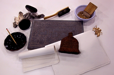 毛笔、墨汁、扑子(又叫扑包)、打刷、排笔、白芨(jī)水(白芨)、石碑,鬃(zōng)刷,吸水纸、龟纹宣纸。