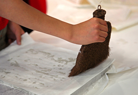 扑子又叫扑包,是用棉花、绸布和细绳绑扎做成,是拓印时上墨(上色)的主要工具。用毛笔在扑子上涂少量墨。