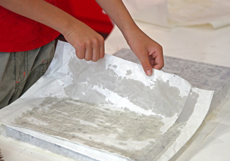 将龟纹宣纸由一端开始慢慢置于石板上,同时在龟纹宣纸上再刷一层白芨水。
