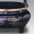 这件铜香炉的口沿、颈部、肩部、腹部都嵌有用金丝装饰的花纹,口部为一圈回纹,肩部为一周阿拉伯文,腹部为莲花。比较特殊的是在它的底部镶嵌的金丝花纹,是回历的年款,翻译过来是回历855年,即公元1450年,明景泰元年...