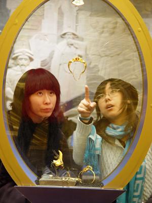 该片拍摄时间是2006年12月29日。我到中华世纪坛参观“游牧人的世界——俄罗斯艺术大师达西”的作品,同时参观的还有一批中学生。我看到两个女孩被达西魅惑迷人的珠宝首饰作品深深地吸引,同时该珠宝首饰的展台造型别致,我即举起相机从对面抓拍两女孩看展台的情景。