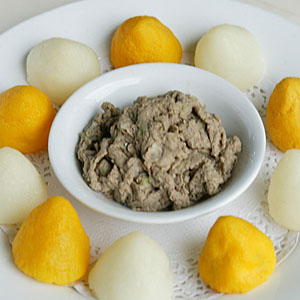宫廷风味食品,将研磨极细的玉米面和黄豆面过筛,加入白糖、桂花制成栗子大小的窝头,具有栗子的清香味。(编写:朱锴)