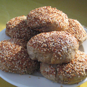 一般作为早餐或涮羊肉的主食。主要由面粉、芝麻酱、芝麻仁为主要原料烘烙而成,呈金黄色,一面挂有芝麻仁,皮脆内软。切开后横断面层次清晰,有15~16层,薄厚均匀。(编写:朱锴)