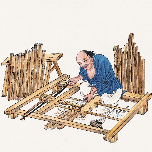 过去木匠制作圆柱形有花样的桌椅腿、楼栏杆须用旋床。旋床是木架床,床两端有轴,将需要制作花样的木棍嵌入旋床,一手牵引皮条使木棍旋转,另一手握刨子形式的刀子,刮削出花样。除去制作椅腿、楼栏杆,还可以制作捣蒜锤、棒槌等物。旋木工活的木匠又称旋床子匠。