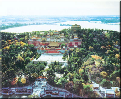 昆明湖上点缀着三座岛屿象征传说中的三座仙境神山,岛上各有一座主体建筑。目前仅有南湖岛上的涵虚堂留存至今。