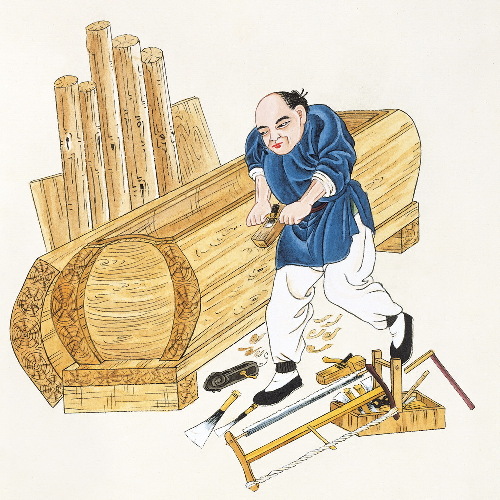 做棺材的木匠,在老北京单是一行,谓之斜木行,专做所谓“轻重寿材”。北京人要面子,死了也要有个“好房子”,所以棺材铺的生意非常好做,做棺材的成为一大行。