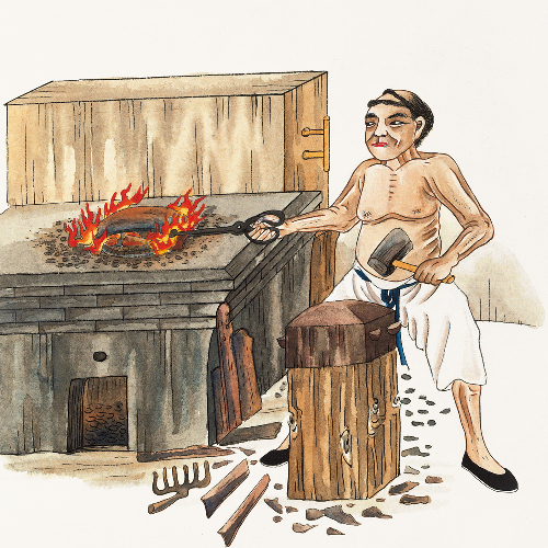 老北京的铁匠,也称为“小炉匠”。一种是肩挑或者推着小车,沿街串巷,为住户修理铁活、打烟筒等;一种是在铁铺打铁。民间小铁匠铺一般是师傅带帮工、学徒干活。师傅掌锏、看火候、成型、沾火,徒弟抡油锤、敲镇子、添煤、拉风箱,叮叮当当,一年四季,不分严寒酷暑,铁匠总是汗流浃背,非常辛苦,体质弱者,扛不下来铁匠的活。老字号“王麻子”剪刀,始于清顺治年间,是靠铁匠们的精心打造而树立老北京名牌。