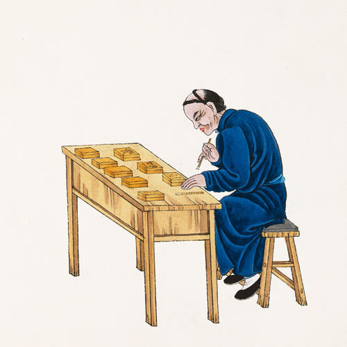清代科举殿试答卷的字迹讲究黑亮、滑润,砚台研磨费时且墨色难调,于是铜墨盒应运而生。盒内放有丝棉,注入调好的墨汁,书写时蘸墨十分方便。《光绪顺天府志》记载,铜墨盒创始于道光年间,同治、光绪时期较为兴盛。最先在盒上刻字者名叫陈寅生,据说他善刻小楷,微如芝麻,能在二三寸见方的盒盖上刻成一篇《兰亭序》。刻字之后又有刻制花卉、翎毛、山水、人物的样式,张樾臣的作品最负盛名,远销日本、欧美等地。《北京繁昌记》云:“北京之墨盒,与江西南昌之象眼竹细工及湖南之刺绣,为中国之三大名物。”