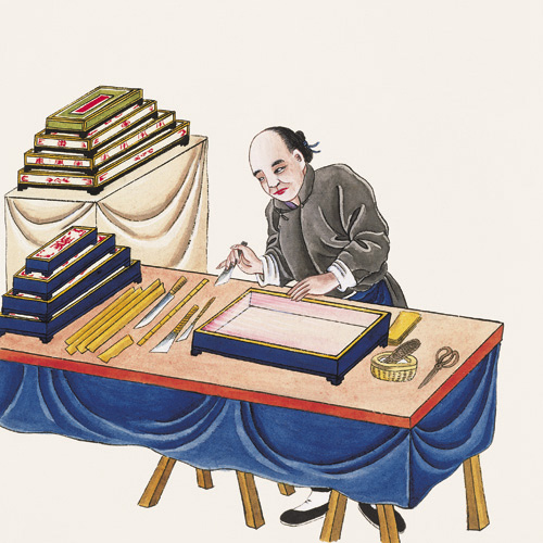 锦匣及玻璃匣是用来盛古玩、玉器、瓷器等贵重易碎品的器物。做锦匣为特种工艺,珍玩玉器须卧囊,只许看原物,不能沾手,全凭目测计量,做出来严丝合缝,堪称一绝。当时古玩行生意不景气,做这行的不多。