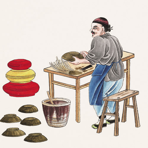 漆盒是指年节送礼的八盒,用木胎涂石面做成,再油绘。旧时送礼大都是连盒送,所以需求较大。