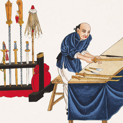 戏台上所耍的古代刀枪剑戟等兵器习称“刀枪把子”。做刀枪把子的必须懂戏才能将刀枪把子做好,而一些名角儿对刀枪把子也很挑剔,形制、体量既要个性分明,表演起来也要如臂使指,因此他们往往有固定的刀枪把子铺为其量身定做。