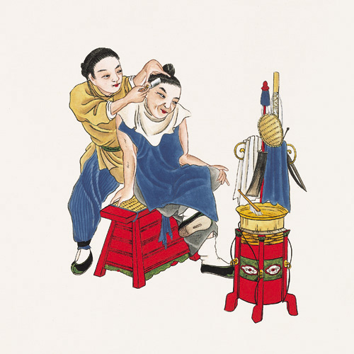 剃头即理发。清初,强迫汉人学满人的样子,剃头留辫子。许多地方皆有“正月理发死舅舅”之说。“死舅”是“思旧”的谐音,盖以此来表达对“剃发令”的抵制。老北京的剃头挑子一头是炉子,外挂煤炭袋子、毛巾等;另一头是个柜子,有几层抽屉,放折迭的镜子、剪子、剃刀、刮脸线儿、皂角块儿,下面还放有水桶、小凳儿。故俗语有“剃头挑子一头热”之说。剃头匠走街串巷,但从不吆喝,而是打“唤头”。“唤头”是铁制的,又叫响铁、“报君知”,形如大夹子,用铁棍拨打即发出响声,以招徕顾客。