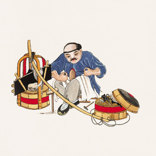 穷人的鞋子破了或者开绽,一般舍不得丢掉,找鞋匠修补一下接着穿。鞋匠俗称皮匠,以修旧鞋为主。其所做之活,除缝补外,还有钉前后鞋掌、钉偏掌,打虎皮头等。皮匠担一副挑子,一头拴着筐子,里面放着许多铁掌、钉子、秋皮丁和一些碎皮子,一头拴上个铁锤和丁字形铁拐子。皮匠的扁担也较特别,两头高高翘起,同一般挑挑子的扁担不一样。