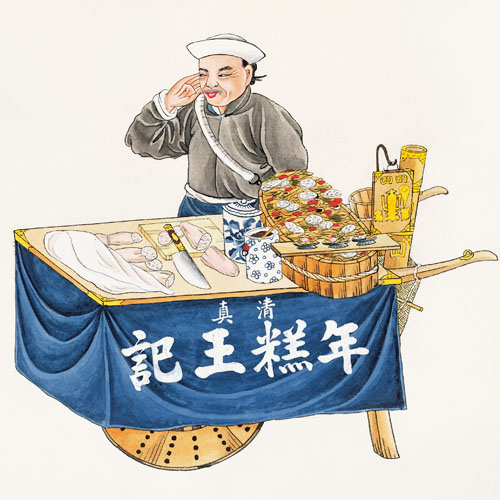 图中小贩的车右侧有一个汤瓶牌,上写“回回”二字,过去操此业者以回民居多。有的汤瓶牌上还写着“清真古教西域回回”。案子上有托盘、青花罐、成节的江米藕和刀。托盘上放着的是切成片的江米藕,红色的金糕,绿色的青梅,搭配美观,可以起到招徕食客的作用。青花罐内装着玫瑰苜蓿桂花汁。