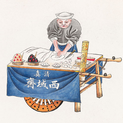 旧历年时小贩大都身挎一个木盘,摆上切成长条形的江米小枣年糕以及蜂糕、艾窝窝等,下街吆喝着:“江米年糕,蜂糕、艾窝窝咧!”