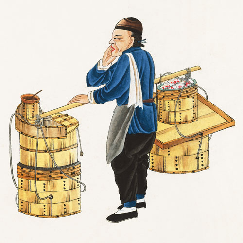 卖面茶的小贩清晨挑担外出售卖,吆喝着:“面茶!”