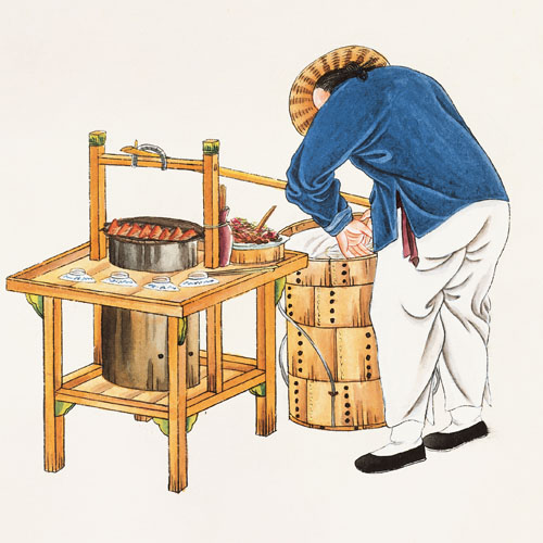 卖卤煮火烧的从肉市趸来猪下水等收拾干净,用过煮烂,放上葱姜大料等提味,快熟的时候放上炸豆腐、火烧。出售时卖主用筷子从锅中夹出猪大肠等,每样少许切成小片,再将火烧切成六瓣,放在碗内,舀上汤,浇上佐料。做得好的卤煮火烧:汤肥而不腻,猪小肠等烂而不糟,火烧也煮得透。