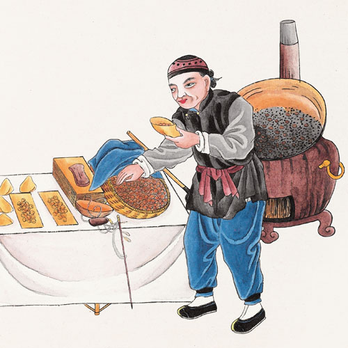 据《析津日记》记载:“苏秦谓燕民虽不耕作而足以枣栗,唐时范阳为土贡,今燕京市肆及秋则以炀拌杂石子爆之,栗比南中差小,而味颇甘,以御栗名。”由此可见,糖炒栗子的历史久远。二十世纪三十年代,每逢秋后,北京的干果店都要专门出售糖炒栗子,以北京燕山出产的板栗、油栗为原料,在大铁锅中拌上饴糖、粗砂粒翻炒,炒出来的栗子油亮,外壳自然开裂,味道甘甜。