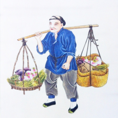 卖菜的小贩,推着架子车或挑担子,大清早到各大菜市场,如天桥、日坛、月坛,趸些时令蔬菜运到城里走街串巷叫卖。卖菜的讲究吆喝,细数菜品,声音清脆。卖菜的利薄,特别注重技巧,比如常走哪几条胡同,哪几家是常主顾,都喜欢什么菜,全记在心里。市面有什么菜,立刻送上门,不单能有个好价钱,也省却跑好多路、干吆喝。