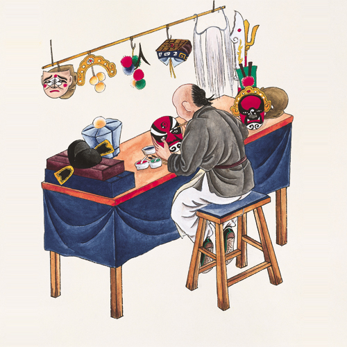行头,是金、元时起对戏具的统称。《扬州画舫录》称“戏具谓之行头,行头分为衣、盔、杂、把四箱”。“衣”就是指演员身上的衣服、鞋以及身上的零碎东西等,“盔”指盔、帽、冠、巾这几种东西。还包括了发髯和髯口等头上用的东西。“杂”是指彩匣子、水锅和梳头桌。“把”是指旗、刀、枪等带把的道具。
