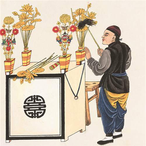 供花多是用纸、布或绢等做成的。将材料上刻成福禄寿、八仙等人物,在写上吉祥话等,然后涂上颜色,粘在一根细铁丝上。春节时给神仙和祖先上供的供品,如蜜供、年糕等都要插上供花。小贩叫卖:“供花咧,拣样儿挑!”