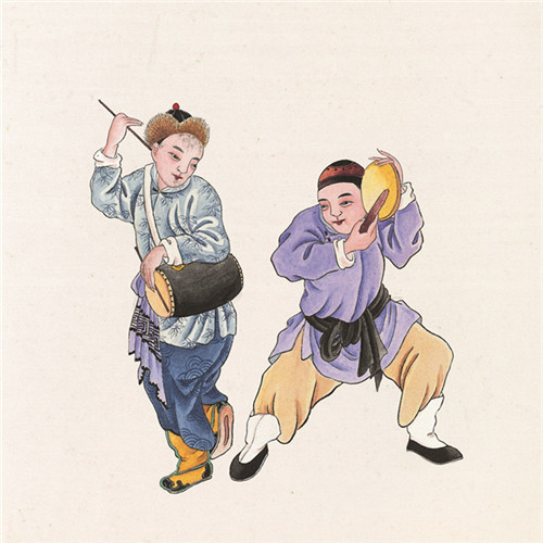 花鼓是明清时期流行的民间歌舞,起源于安徽凤阳。最早是农民在田间插秧时,击鼓演唱,后来较普遍的表演形式是一男一女,男敲小镗锣,女打小花鼓,边歌边舞。