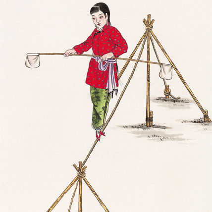 古代杂技已有踩绳之术,《晋书》载西方传入杂技,有两女对舞行于绳上者。后此技遍于天下,大体南方谓之“走索”,北方统称“踩绳”。踩绳表演者一般为青年女子,行走绳上,手持一竿,两端系有平衡之物,或持一伞,于身体一侧旁衬重心。绳长丈余,按其与地面角度,可分平行、斜上两种,后者表演难度较大。清代前期北京地安门外、崇文门外、宣武门内、东安门外、广安门外、护国寺、隆福寺、花市等处均有踩绳献艺,清末唯天桥可寻,因其表演空间要求,非开阔地面不能为之。