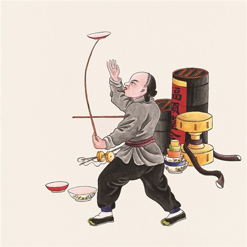 杂技“舞盘”,北京俗称耍盘子耍碗的,戏法艺人亦可兼演。表演者手执三尺左右的细长竹竿,竿顶镶有一枚大针,以瓷盘或瓷碗置于针上,使其转动,飞旋不坠。功夫上乘者能够同时手执六竿以上,并施展翻筋斗等技艺。舞盘之术由来已久,北宋陈旸所著《乐书》记:“汉世有盘舞,梁谓之舞盘伎。”按此图,卖艺人道具中还备有大小空竹。空竹初为玩具,后亦引入杂耍,花样繁多,诸如撇高、串腕、骗马、过领、钓鱼、猴爬竿、苏秦背剑等。铁轴大空竹,鼓径过一尺,惟北京有之。