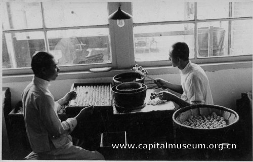 鹤年堂伙计们在工作间手工为蜜丸封蜡