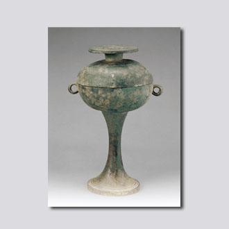 此豆的盖子可倒置做浅盘,圈足上以红铜(即纯铜)镶嵌出虎纹。在青铜器上镶红铜的装饰工艺盛行于东周时期。