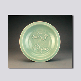 宋(公元1127-1279年)高7.3厘米 口径37.3厘米 龙泉窑从宋代始烧,一直到清朝,南宋为龙泉窑烧制的高峰,采用薄胎厚釉的技术,多次上釉,烧出龙泉窑最好的釉色-粉青、翠青、梅子青。此盘心贴两条相向的翼龙 ,釉色青翠。