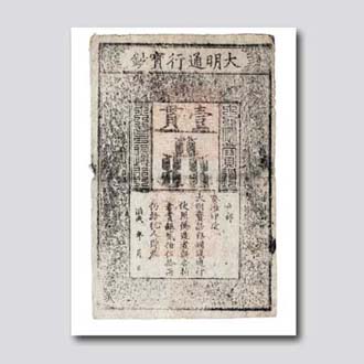 大明宝钞以桑皮纸为印钞材料,一贯钞长一尺,阔六寸,即36.4 χ 22 厘米,是中国票幅最大的纸币。票面上端为“大明通行宝钞”六个汉字,中部顶端为“壹贯”钞额,其下为十串铜钱图案,两侧分别为篆书“大明宝钞”“天下通行”字样。再下端注文曰“户部奏准印造大明宝钞,与铜钱通行使用,伪造者斩,告捕者赏银贰佰伍拾两,仍给犯人财产。洪武 × 年× 月× 日”。宝钞四周饰以龙纹及海水图案。明太祖朱元璋洪武八年(1375年),建立纸币本位制度,设宝钞提举司,立钞法。发行的“大明通行宝钞”是不兑换纸币。