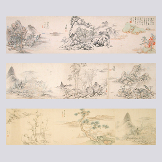 董其昌(1555-1636),字玄宰,号思白、思翁、香光居士,华亭(今上海松江)人,"华亭派"代表画家,明代后期绘画的领袖人物。擅画山水,气韵秀润,潇洒生动。提倡文人画,对清代画坛有很大影响。康熙、乾隆帝都喜爱他的书画,以致当时全国斐然从风。此画为合作图卷,首段董其昌画没骨山水,自题"芦乡秋霁",又有陈继儒题字一段,称以"鲈乡"名图更佳。其后,庄严、诸念修、李绍箕、陈廉、释蕉幻、蓝瑛、吴振续画,蓝瑛署年款"癸丑(万历四十一年,1613)",吴振署"壬子(万历四十年,1612)"。